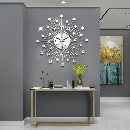 Modern 3D Crystal Wall Clock - 12.4 Inch Silver Mirror with Diamond Decoration