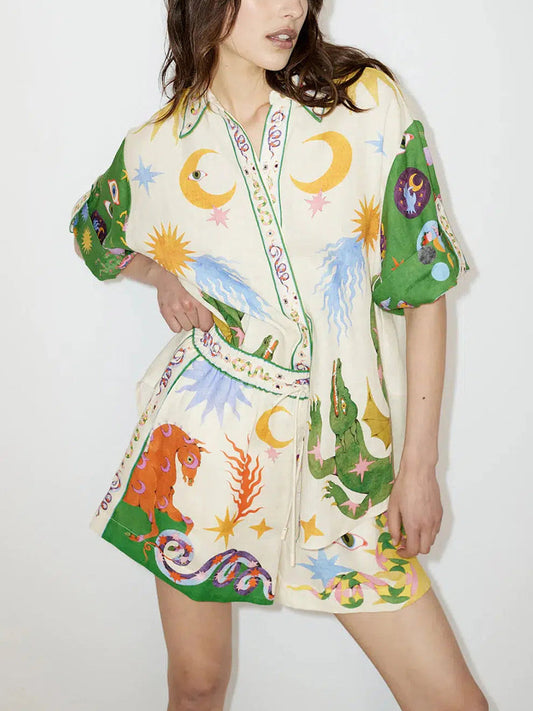 Stylish Women's Irregular Star & Moon Print Blouse and Shorts Two Piece Set - Perfect for Trendy Fashionistas!