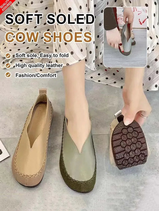 Women Soft-soled Cow Shoes Casual Round Toe Shallow Flat Comfort Soft Leather Loafers Shallow Lightweight Ladies Ballet Flats