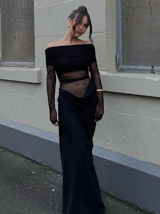 🔥Solid Color Off Shoulder Pleated Sheer Mesh Dress