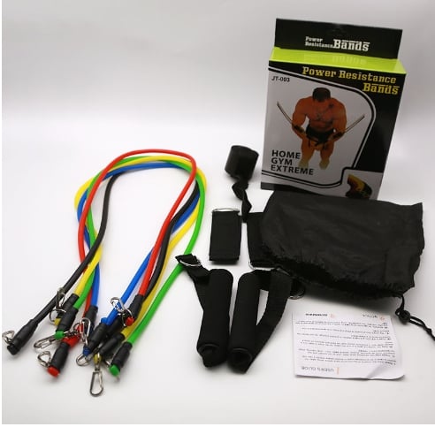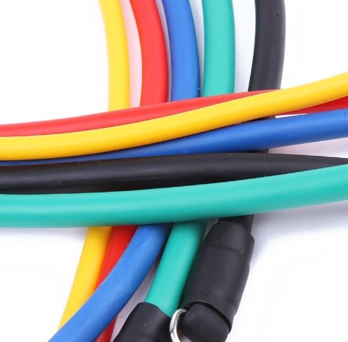 The set includes a yellow band (2-4 lbs.), a blue (4-6 lbs.), a green (10-12 lbs.), a black (15-20 lbs.) and a red one (25-30 lbs.). All bands are 48 inches in length and are suitable for all kind of sports and gym workouts, like Yoga, Pilates, TRX, Cross Training, powerlifting, physical therapy and rehabilitation treatment.