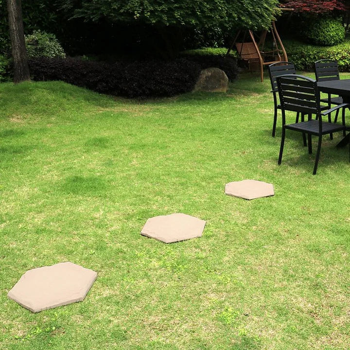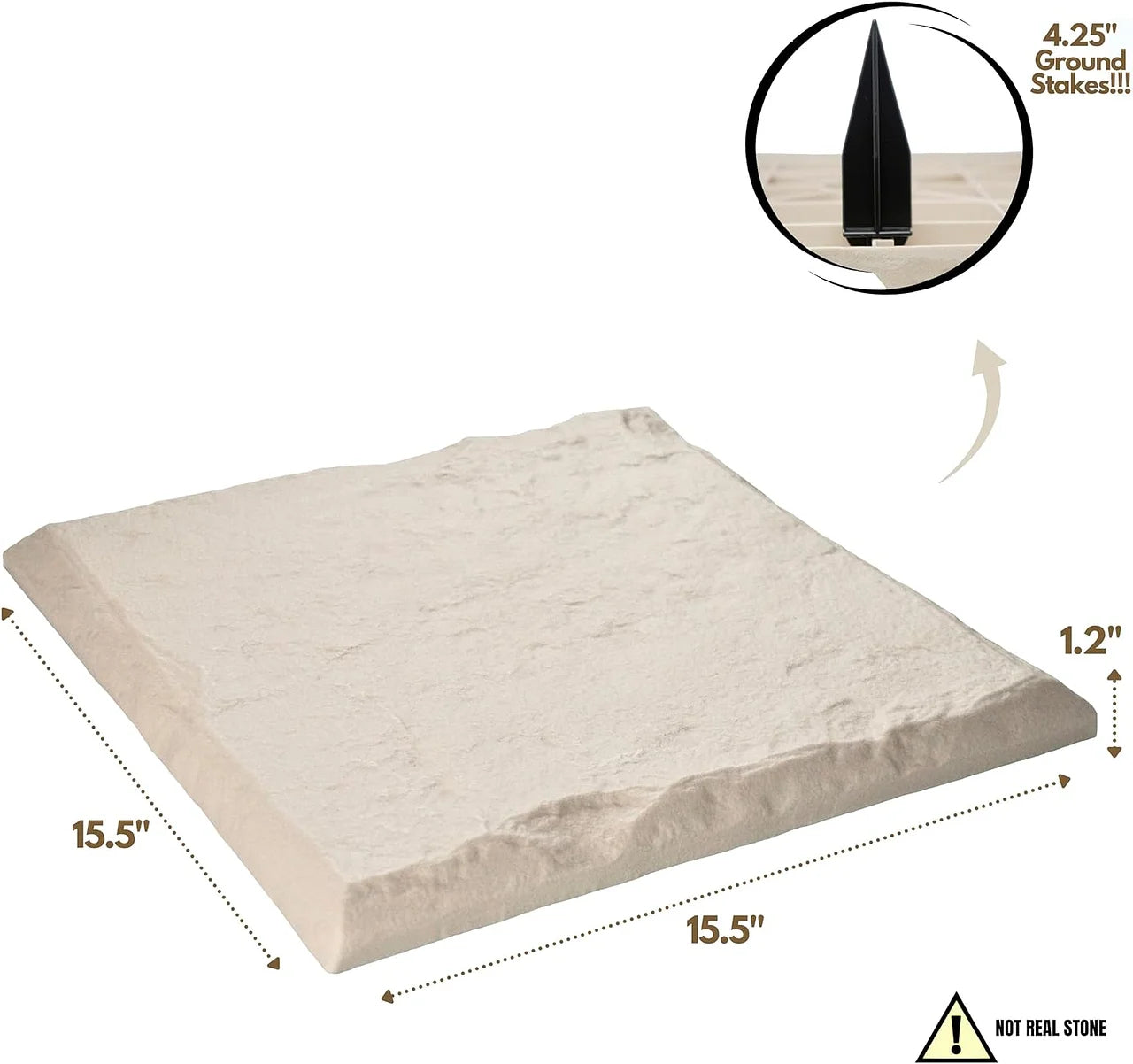 - 15.5” INNOVATIVE DESIGN - This lightweight, innovative design measures 15.5" x 15.5” and features four LARGE ground stakes that measure 4.25" long by 2.5" wide and attach to the bottom of each stepping stone, helping to keep them in place.
