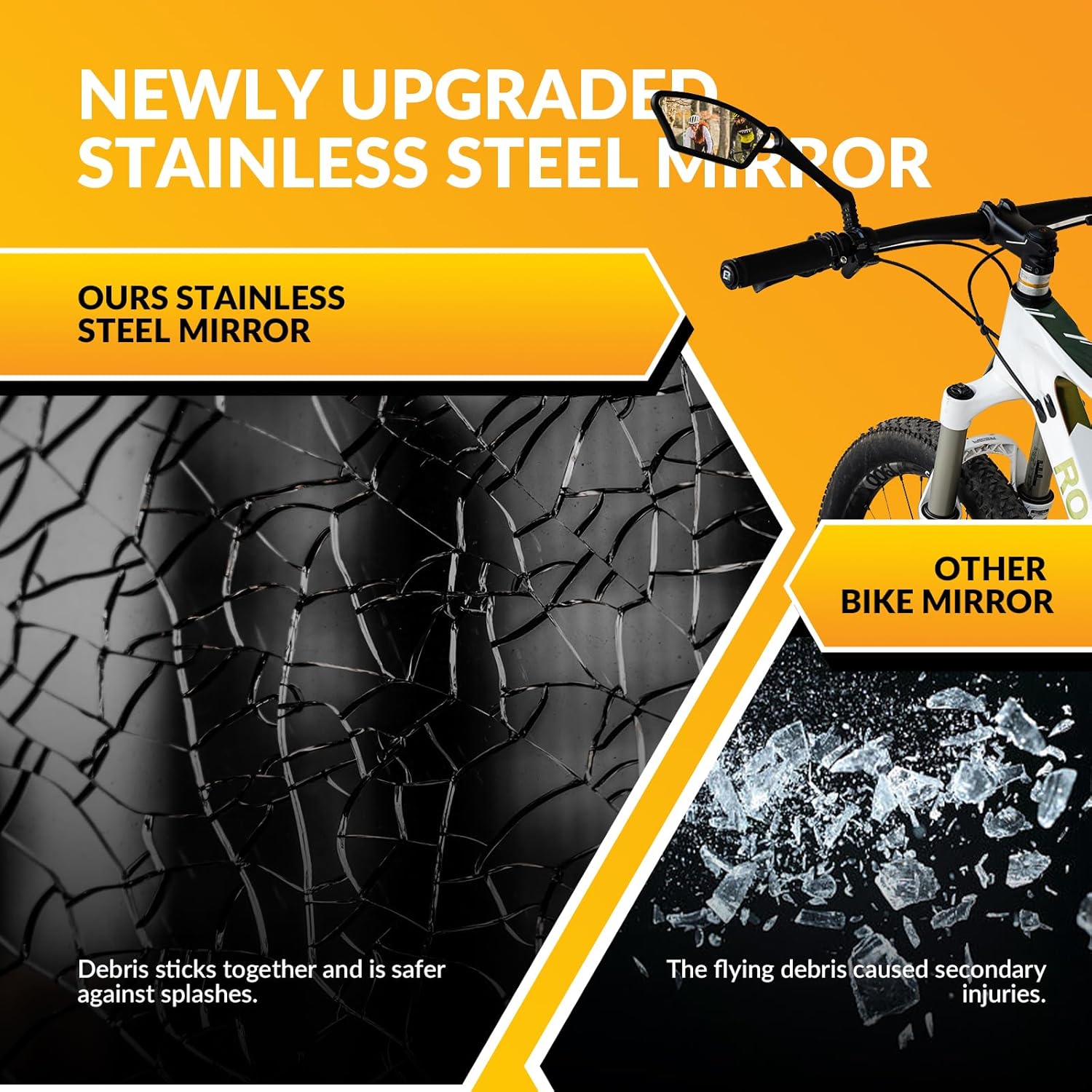 【Clear & Security】Bike mirror, with a polished surface, offers a clear, wide view for easy tracking of traffic behind you. Built with stainless steel, it ensures impact resistance comparable to car safety glass—reliable and safe for your rides.